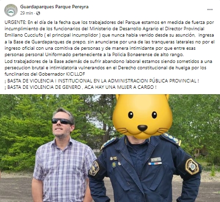 “URGENTE: En el día de la fecha que los trabajadores del Parque estamos en medida de fuerza por incumplimiento de los funcionarios del Ministerio de Desarrollo Agrario el Director Provincial Emiliano Cucciufo (el principal incumplidor ) que nunca habia venido desde su asunción, ingresa a la Base de Guardaparques de prepo, sin anunciarse por una de las tranqueras laterales no por el ingreso oficial con una comitiva de personas y de manera intimidante por que entre esas personas personal Uniformado perteneciente a la Policia Bonaerense de alto rango.