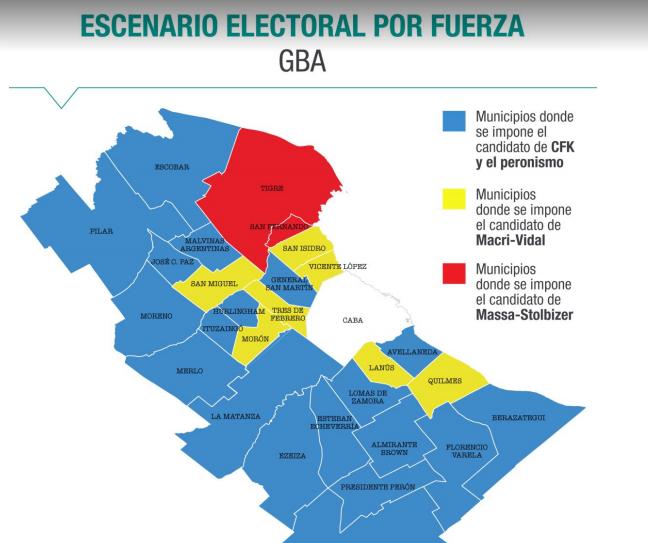 En este escenario, el FPV-PJ se impondría en 19 municipios, en tanto que el candidato de Macri-Vidal lo haría en 7 y el de Massa-Stolbizer en los restantes 2.