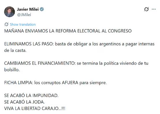 “MAÑANA ENVIAMOS LA REFORMA ELECTORAL AL CONGRESO. ELIMINAMOS LAS PASO: basta de obligar a los argentinos a pagar internas de la casta. CAMBIAMOS EL FINANCIAMIENTO: se termina la política viviendo de tu bolsillo. FICHA LIMPIA: los corruptos AFUERA para siempre”, señaló.