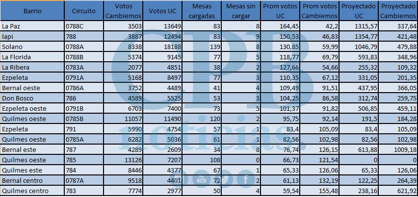 Asimismo, CAMBIEMOS logró muy buenas performances en Bernal Centro, Quilmes Centro, el circuito 785 de Quilmes oeste (más cercano a las vías, La Colonia).