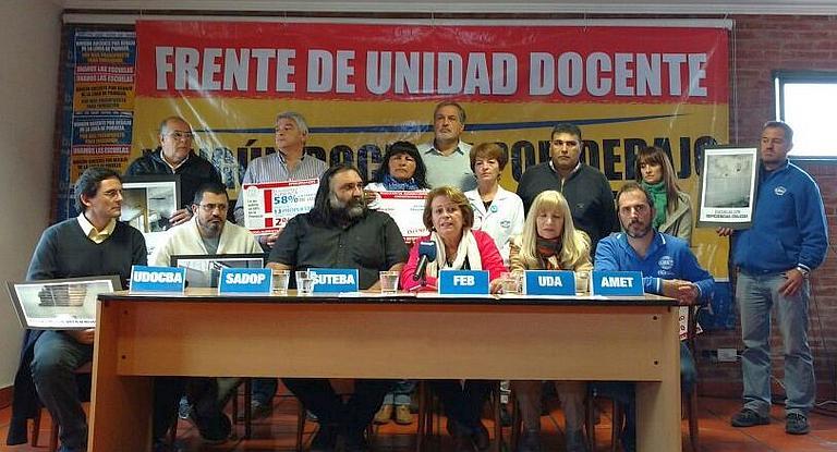 El Frente de Unidad Docente dio una conferencia de prensa en la que los representantes de AMET, FEB, Sadop, Suteba, UDA y Udocba, reclamaron una vez más al gobierno de María Eugenia Vidal una oferta de aumento salarial superadora. También anunciaron que este viernes harán una jornada provincial de protesta con acciones en todos los distritos pero sin paro.