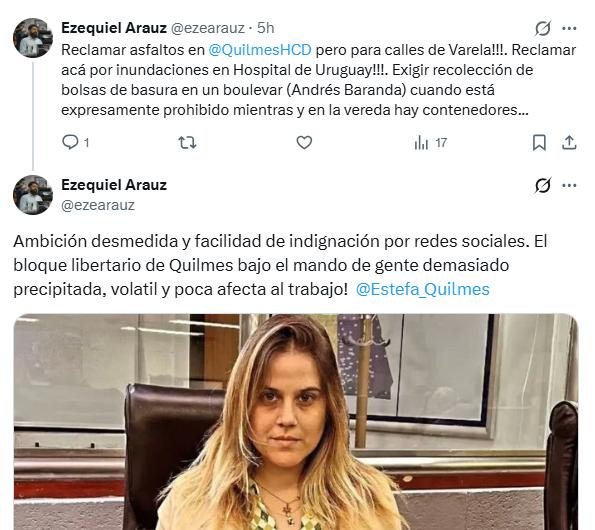 Y finalizó: “Ambición desmedida y facilidad de indignación por redes sociales. El bloque libertario de Quilmes bajo el mando de gente demasiado precipitada, volatil y poca afecta al trabajo! @Estefa_Quilmes”.
