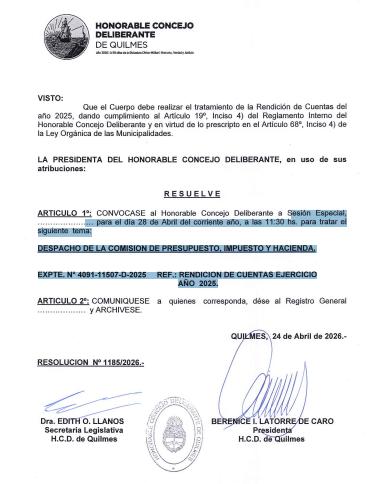 La presidenta del Concejo Deliberante de Quilmes, Berenice Latorre de Caro, convocó a sesión Especial el próximo 28 de Abril.