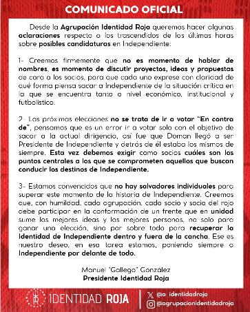 La Agrupación Identidad Roja salió a marcar posición frente a los rumores sobre posibles candidaturas en Independiente. En un comunicado oficial firmado por su presidente, Manuel “Gallego” González, pidieron dejar de lado los nombres propios y poner el foco en las propuestas para sacar al club de la “situación crítica”.